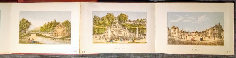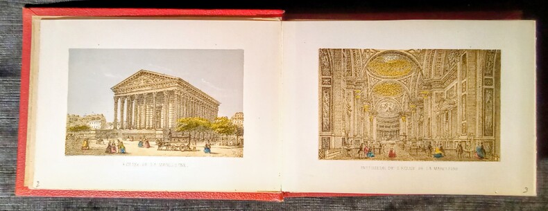 1-Champs-Élysées. 2-Église de la Madeleine. 3-Intérieur de L'Église de la Madeleine. 4-Opéra. 5-Arc de Triomphe du Carrousel. 6-Ministère des Finances. 7-Palais Royal. 8-Église Ste Clotilde. 9-Palais Législatif. 10-Hôtel des Invalides. 11-Cirque des Champs-Élysées. 12-Église St. Sulpice. 13-Palais de Justice et La Ste Chapelle. 14-Cours de la Justice (Vue prise du Pont neuf). 15-Tour St. Jacques-La-Boucherie. 16-Église Notre-Dame. 17-Jardin des Plantes (Cabinet d'Histoire naturelle). 18-Val-De-Grâce (Hôpital militaire). 19-Bois de Boulogne...20-St.-Cloud (Cascades et Château). 21-Versailles (Cour d'Honneur). 22-Versailles (Tapis vert). 23-Fontainebleau (Cour de la Fontaine et l'étang aux Carpes). Bon état, complet de cette autre édition de Charles Rivière.