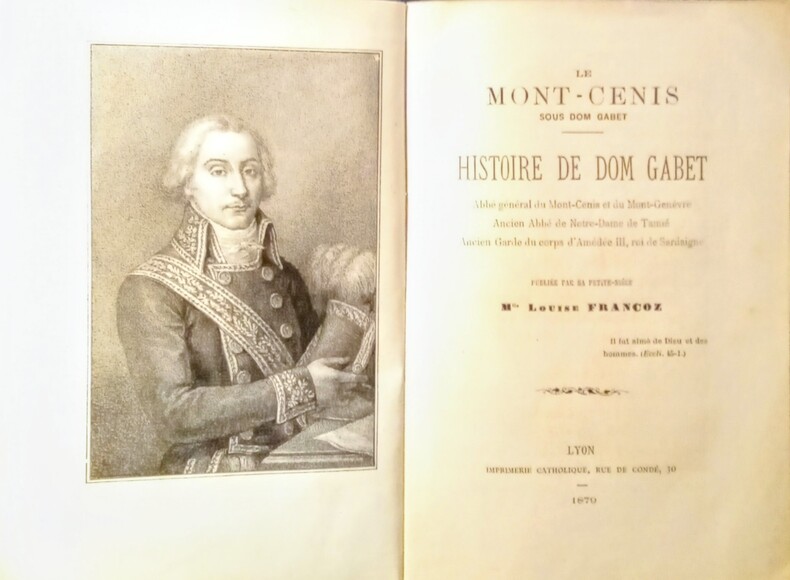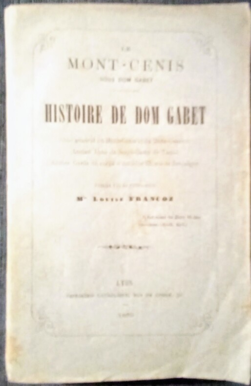 Le Mont-Cenis sous Dom Gabet – Histoire de Don Gabet. Abbé général du Mont-Cenis et du Mont Genèvre. Ancien Abbé de Notre-Dame de Tamié. Ancien Garde du corps d'Amédée III, roi de Sardaigne. Orné de 6 planches hors-texte. Lyon, Imprimerie Catholique, 1879. In-8 (18,5x12,5cm) broché de couverture d'origine imprimée, coins écornées. 216pp.