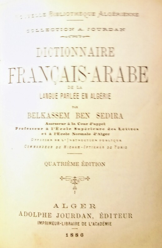 Quatrième édition. Alger, Adolphe Jourdan, Éditeur «Nouvelle Bibliothèque Algérienne -Collection A.Jourdan», 1886. Fort in-16 (15x4x9,8cm) cartonnage rouge éditeur, légendes dorées sur plat supérieur, dos lisse avec légendes et fleurons et plat inférieur avec Armes dorées au centre. LXIV,928pp.