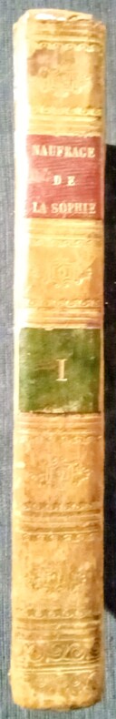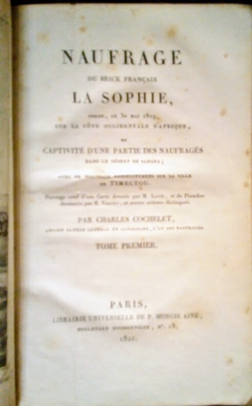 La Sophie, perdu le 30 mai 1819, sur la Côte Occidentale d'Afrique, et Captivité d'une Partie des Naufragés dans le Désert de Sahara; Avec de Nouveaux Renseignemens sur la Ville de Timectou. Ouvrage orné d'une Carte dressée par M. Lapie, et de Planches dessinées par H. Vernet, et d'autres artistes distinguées. Tome 1er seul, avec planches et carte (2 planches dépliantes, 1 planche hors-texte, 1 fac-simile du billet de Sidy Hamet et 1 carte incomplète en fin de volume). Paris, Librairie Universelle de P. Mongie Ainé, 1821. In-8 (21,5x2,5x13cm) relié plein veau brun d'époque, plats dans un encadrement dorés, dos lisse et orné de motifs dorés, titre sur maroquin rouge et tomaison sur cuir noir, tranches marbrées et coins faibles. XVI,348pp.