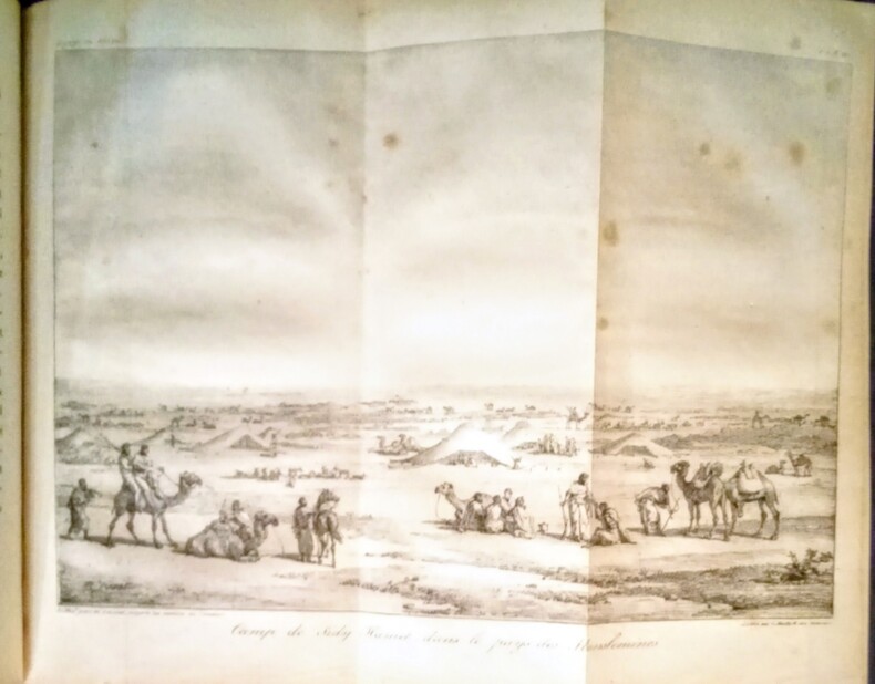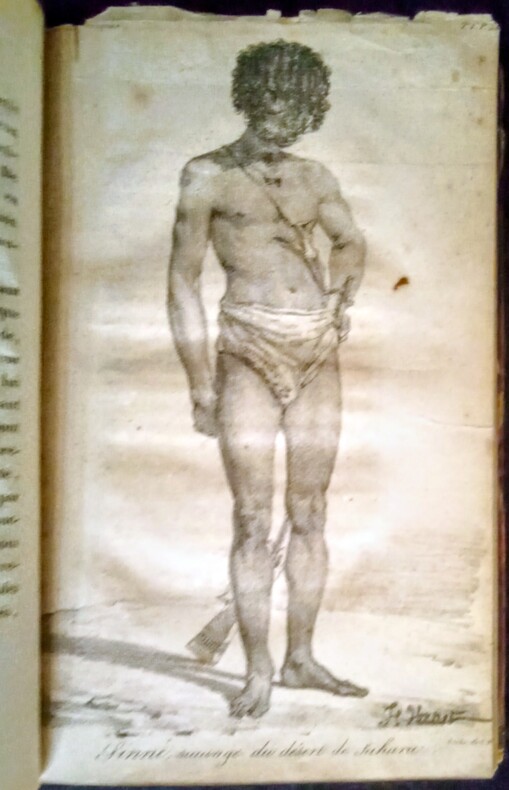 Paris, Libr. Universelle de P. Mongie Ainé, (Impr. de H. Fournier et Cie), 1821, gr. in-8vo, Frontispicelithogr. dépl. VI + 348 p. + 1 planche dépl. (un sauvage du désert du Sahara) / Fontispice lithogr. dépl. 2 ff. + 368 p. + 2 ff. + la grande carte ‘d’une partie d’Afrique’ depl., ex. non rogné, brochures originales imprimées.