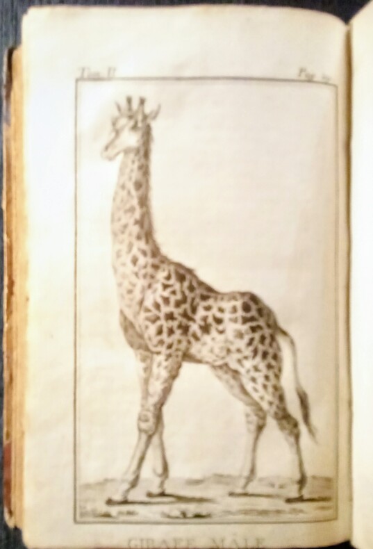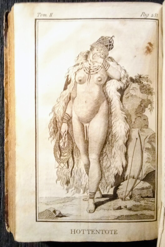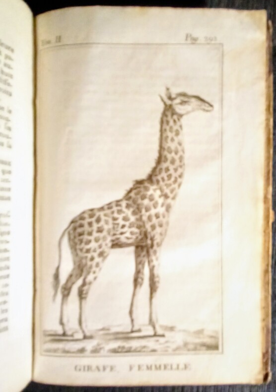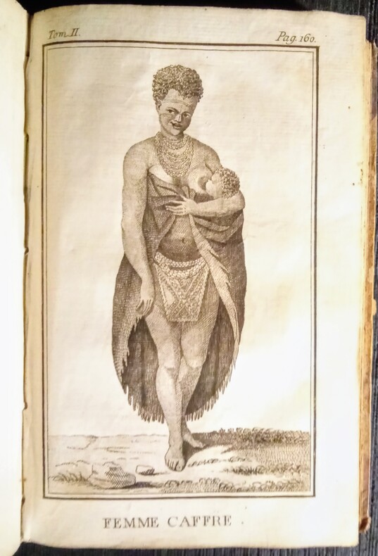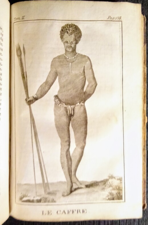 Tome 2 seul complet des 6 gravures: I-Hottentot Gonaquoi. II-Le Caffre. III-Femme Caffre. IV-Hottentote. V-Girafe Mâle. VI-Girafe Femmelle. Et 3 pages de vocabulaires (François-Hollandois-Hottentots.