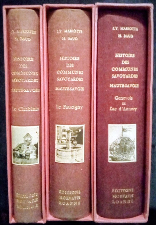 Tome 1: Le Chablais , par Henri Baud et Jean-Yves Mariotte. Nombreuses iconographies. Tome 2: Le Faucigny, par Henri Baud et Jean-Yves Mariotte. Nombreuses illustrations. Tome 3: Le Genevois et Lac d'Annecy, par Jean-Yves Mariotte, Henri Baud, Jean-Bernard Challamel et Alain Guerrier. Nombreuses illustrations. Roanne, éditions Horvath,1980-1981. Soit 3 volumes grands in-8 (17x25cm) reliés toile avec une gravure frappée dans le plat présentée dans un emboîtage «Edition Bibliothèque». 422pp. + 619pp. + 672pp.