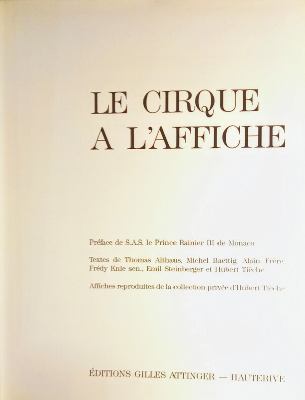 Textes de Thomas Althaus, Michel Baettig, Alain Frère, Frédy Knie sen., Emil Steinberger et Hubert Tièche. Préface de S.A.S. le Prince Rainier III de Monaco. Affiches reproduites de la collection privée d'Hubert Tièche. Editions Gilles Attinger - Hauterive, 1989. Grand in-4 (33x24cm) toile éditeur sous jaquette illustrée en couleurs, petite fente sur la jaquette. 207pp