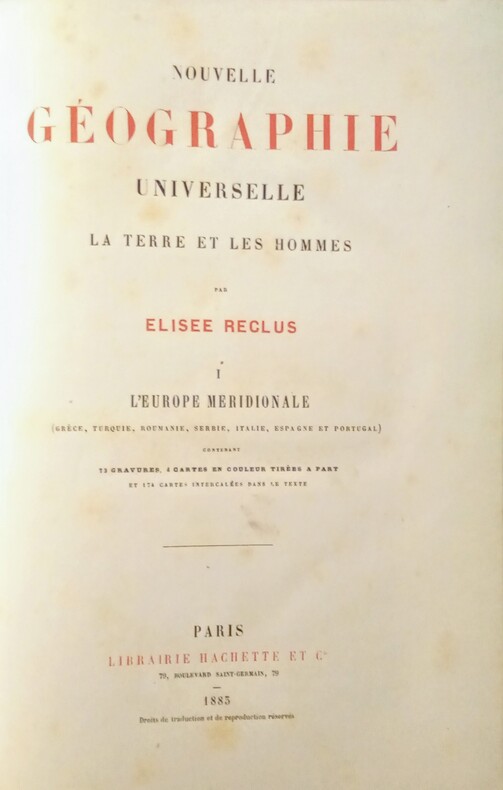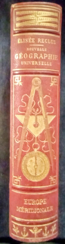 Contenant: 73 gravures, 4 cartes en couleur tirées à part et 174 cartes intercalées dans le texte. Paris, Librairie Hachette et Cie, 1883. In-octavo (28x6x19cm) cartonnage éditeur dit ''Maçonnique'', dos à 4 nerfs orné d'instruments de mesures et de motifs dorés, plats ornés d'un semis de fers à froid dans un triple encadrements de filets dorés, avec au centre une grande composition rouge et noire et or, un globe terrestre doré au milieu d'une rose des vents de navigations (plaque de Souze Relieur), tranches dorées, quelques petites éraflures sur les coiffes et les charnières. 1012pp.