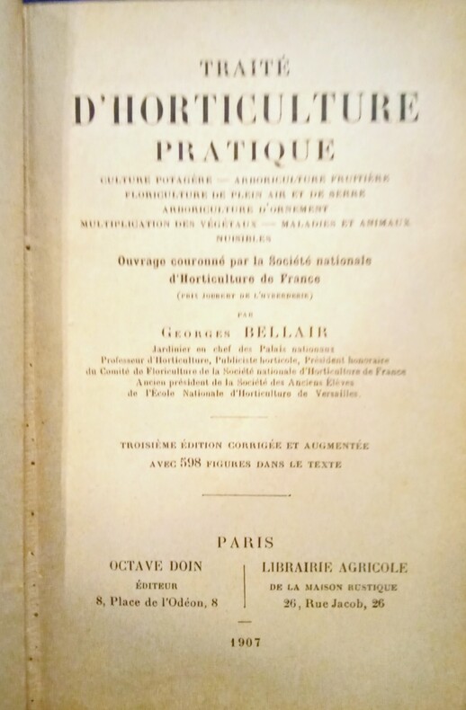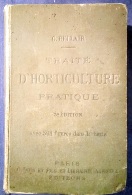 Culture Potagère - Arboriculture Fruitière - Floriculture de Plein Air et de Serre - Arboriculture D'Ornement - Multiplication des Végétaux - Maladies et Animaux Nuisibles. 3ème édition corrigée et augmentée. Avec 598 figures dans le texte. Paris, Octave Doin & Librairie Agricole, 1907. Fort in-12 (18x5,5x12cm) de percaline verte un peu passé. VII,1318pp. .