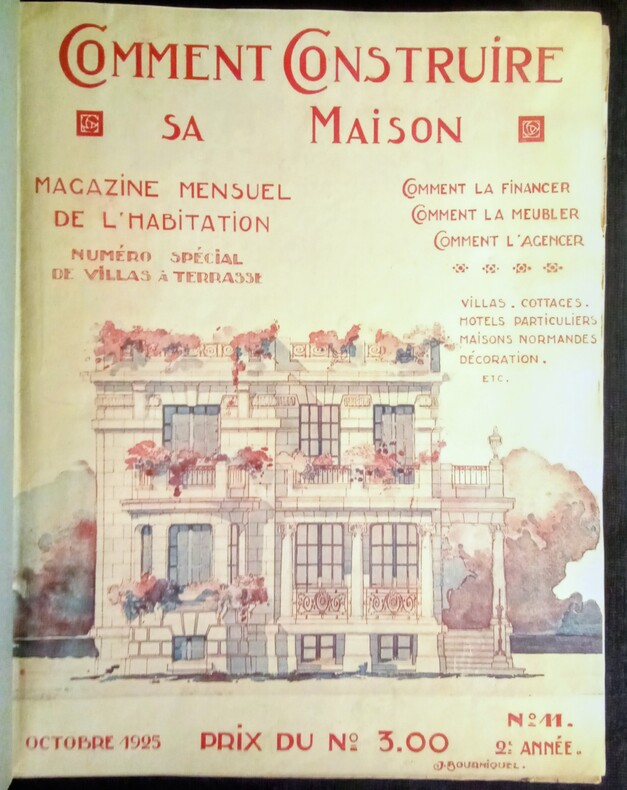 Magazine Mensuel de l'Habitation. Comment la Financer – Comment la Meubler – Comment l'Agencer. Numéro Spécial de Villas à Terrasse. Villas. Cottages. Hôtels particuliers. Maison Normandes. Décoration, etc. N°11- 2ème Année – Octobre 1925 au N°20 -3ème Année – Août 1926. J. Bourniquel, Éditeur, 1925-1926. In-4 (31x2,5x23cm) cartonnage éditeur vert illustré, dos toile verte avec légende or. Pagination multiple.