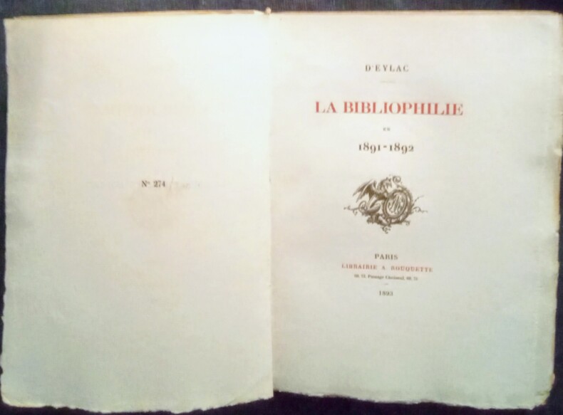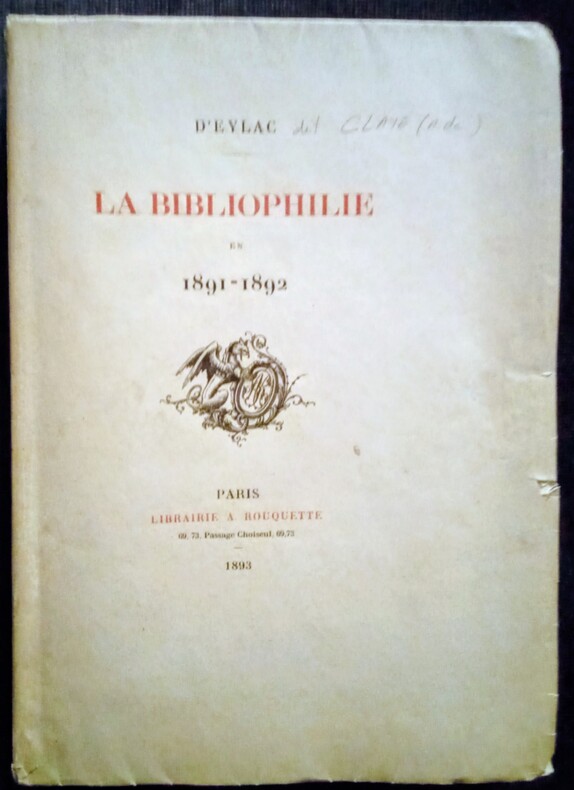 Techener, Rouquette A. Reliure signée 1892 3 volumes in-8 reliés, pour le premier volume : demi-maroquin havane à coins, dos sans nerfs, ornementations du dos avec des figures géométriques, tête dorée, couverture et dos conservés, 165 pp., ex. n°12, portant la mention 'offert par l'auteur' et un bel envoi, pour le deuxième volume : demi-maroquin violet à coins, dos sans nerfs, avec des ornements floraux, tête dorée, ,couverture et dos conservés, 167 pp., ex. n°35 'offert par l'auteur', envoi, pour le troisième volume : demi-maroquin marron à coins, dos sans nerfs, orné de motifs floraux stylisés mosaïqués, tête dorée, couverture et dos conservés, 202 pp., n°65 'offert par l'auteur', les trois reliures sont signées Pétrus Ruban, et étaient les ouvrages que l'auteur, D'Eylac (A. de Claye) a offert à son ami relieur Pétrus Ruban, l'ensemble est un florilège des publications de l'auteur dans la Moniteur Universel dans la rubrique 'Tablettes du Bibliophile' ; reliures avec quelques infimes frottements sans aucune gravité, les trois ouvrages forment un ensemble avec de très belles reliures, très bel état général. Livraison a domicile (La Poste) ou en Mondial Relay sur simple demande.