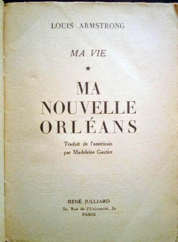 Traduit de l'américain par Madeleine Gautier.Paris, René Julliard, 1952. In-8 (19x14,5cm) broché, couverture à rabats illustrée de photographies de Louis Armstrong et de sa famille. Texte inédit de Hugues Panassié au 1er plat. 236pp. [Premier volume et seul paru des mémoires de Louis Armstrong.]
