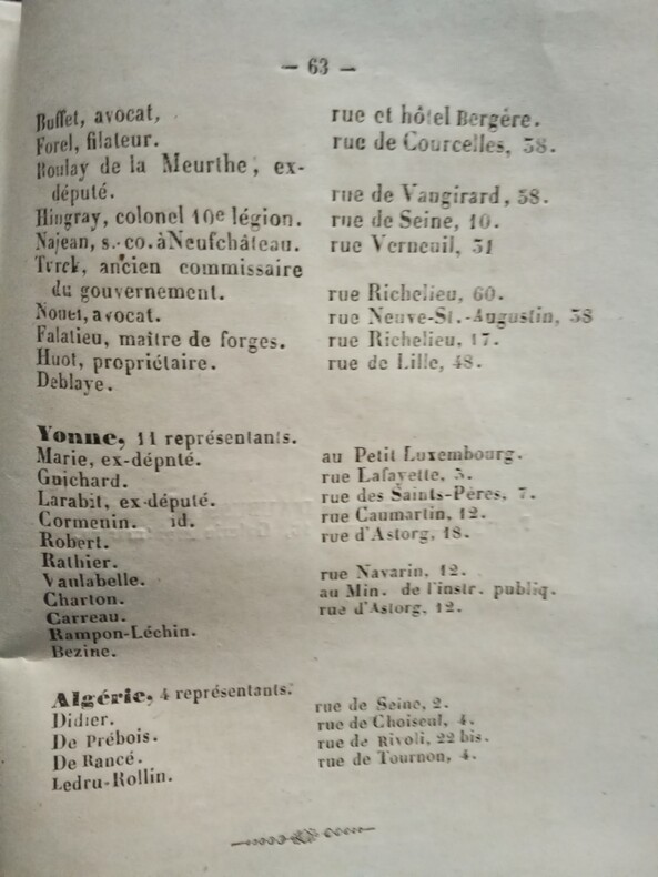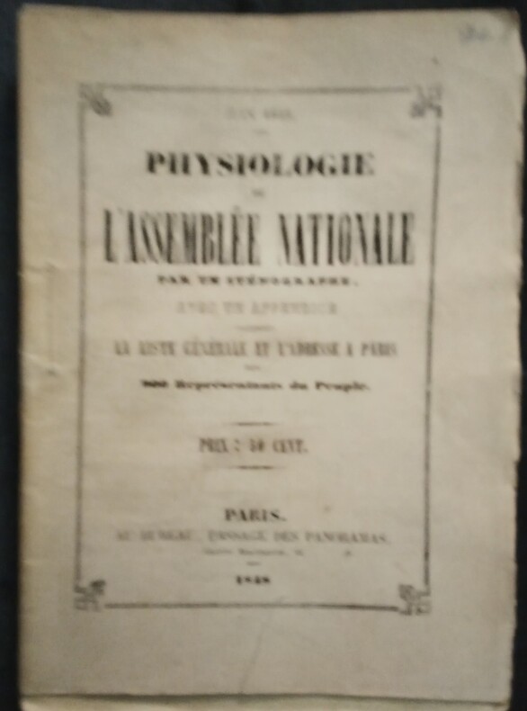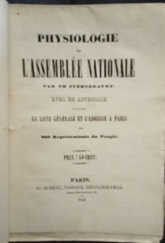 Avec un Appendice contenant La Liste Générale et L'Adresse à Paris des 900 Représentants du Peuple. Paris, Au Bureau, Passage des Panoramas, 1848. In-12 (16,5x12cm) broché de couverture d'origine imprimée, petite déchirure sur la couverture. 63pp.
