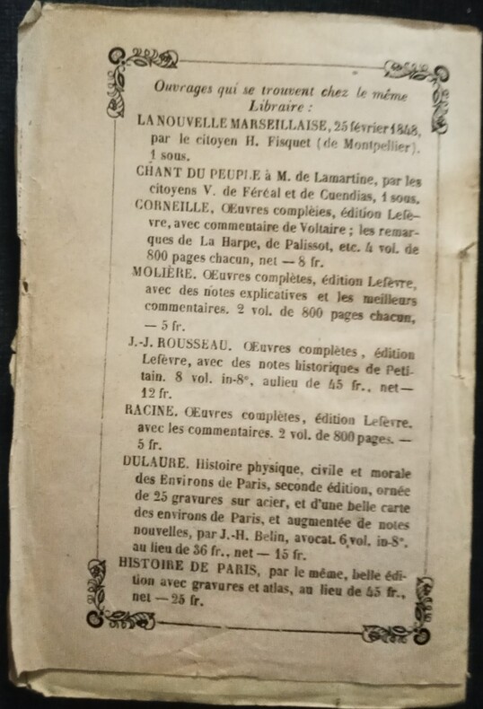 Paris, Mansart et Poullain, Libraires-Éditeurs, Boulevart Saint-Denis, 9 bis, 1848. In-16 (15x10cm) broché de couverture rose d'origine avec légendes imprimées dans un encadrement. 71pp.