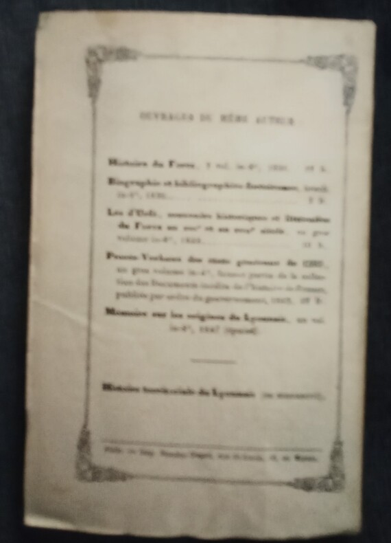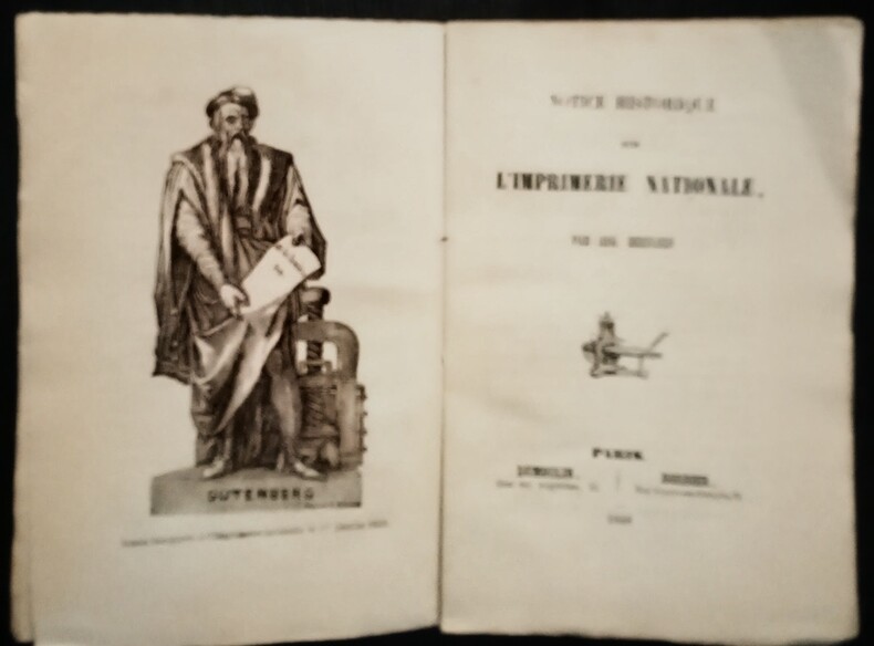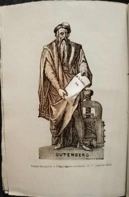 Avec en frontispice une illustration de Gutenberg (Statue inaugurée à l' Imprimerie nationale le 1 er janvier 1843). Paris, Dumoulin, Quai des Augustins, 13 & Bordier, Rue Vieille-Temple, 75, 1848. In-16 (14x9,5cm) brochure d'époque de l'éditeur, couvertures et dos imprimés, plats dans un encadrement. 128pp.