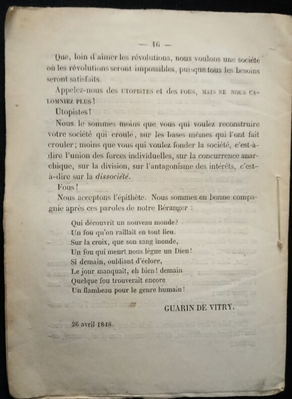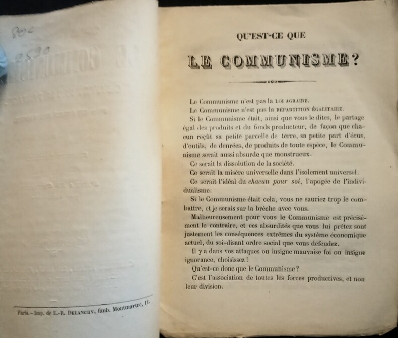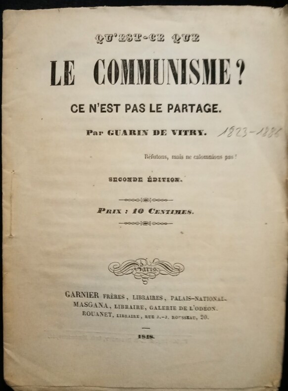 Ce n'est pas le partage. Réfutons, mais ne calomnions pas! 2 ème édition. Paris, Garnier frères, Libraires, Palais-National – Masgana, Libraire, Galerie de l' Odéon – Rouanet, Libraire, rue J.-J. Rousseau, 20, 1848. In-12 (16,5x12cm)brochure d'époque de couverture de l'éditeur, légendes imprimées sur le plat supérieur. 16pp.