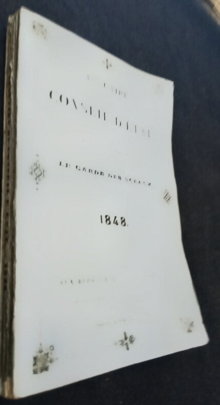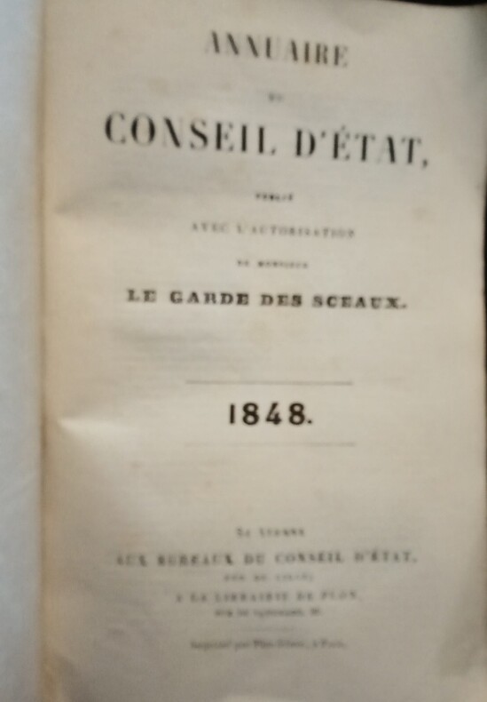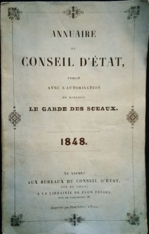 Paris, Se trouve Aux Bureaux du Conseil d' État, rue de Lille; A la Librairie de Plon Frères, rue de Vaugirard, 36. Imprimé par Plon frères, à Paris, 1848. Petit in-8 (17,5x1,5x11cm) brochure d'époque de l'éditeur, couverture bleue imprimée dans un décor d'encadrement, petit manque au dos. 234pp.
