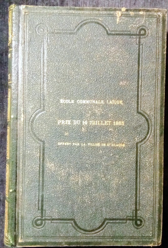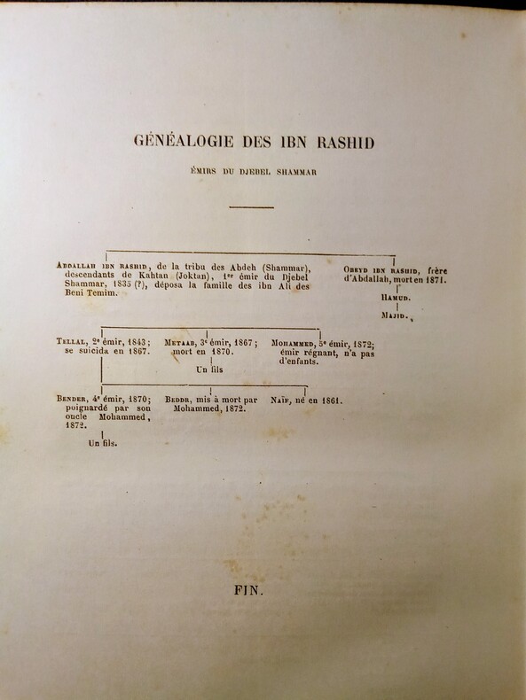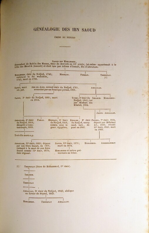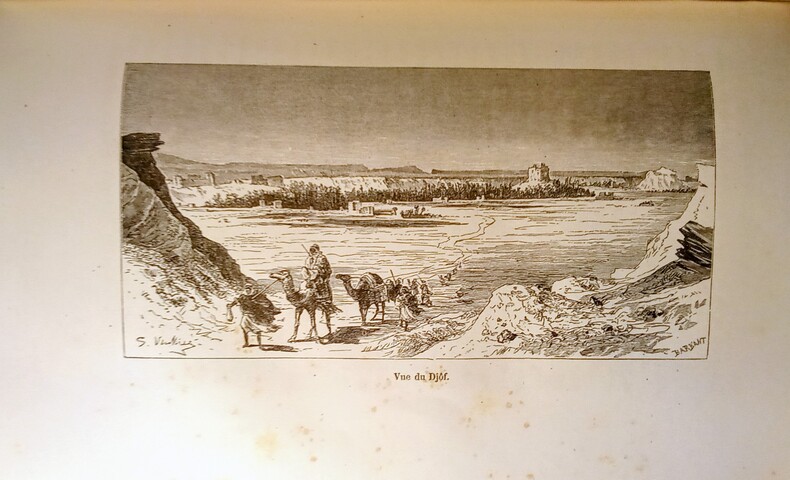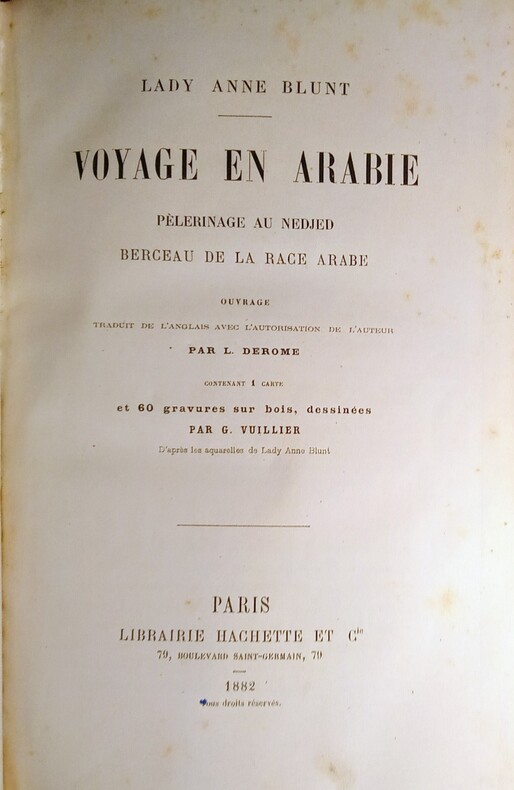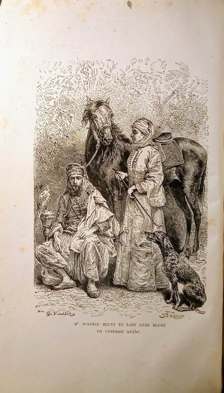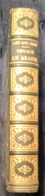 Pelerinage au Nedjed, Berceau de la Race Arabe.Ouvrage traduit de l'anglais avec l'autorisation de l'auteur par L. Derome. Contenant 1 carte et 60 gravures sur bois, dessinées par G. Vuillier d'après les aquarelles de Lady Anne Blunt, de 2 tableaux généalogiques.1:Généalogie des IBN Saoud- Émirs du Nedjed.2:Généalogie des IBN Rashid-Émirs du Djebel, Shammar.Paris, Librairie Hachette et Cie,1882. In-8-16x24cm,relié demi chagrin vert,dos à faux-nerfs et orné de caissons dorés, tranches dorées, plat vert avec mention:Prix du 14 juillet 1883,offert par la Ville de Saint Claude.LXVIII,447pp.