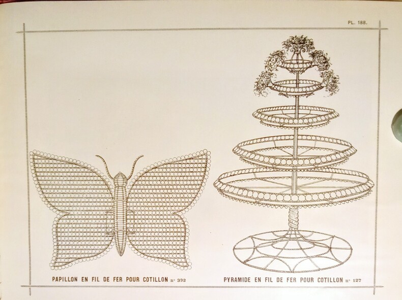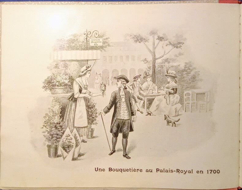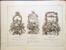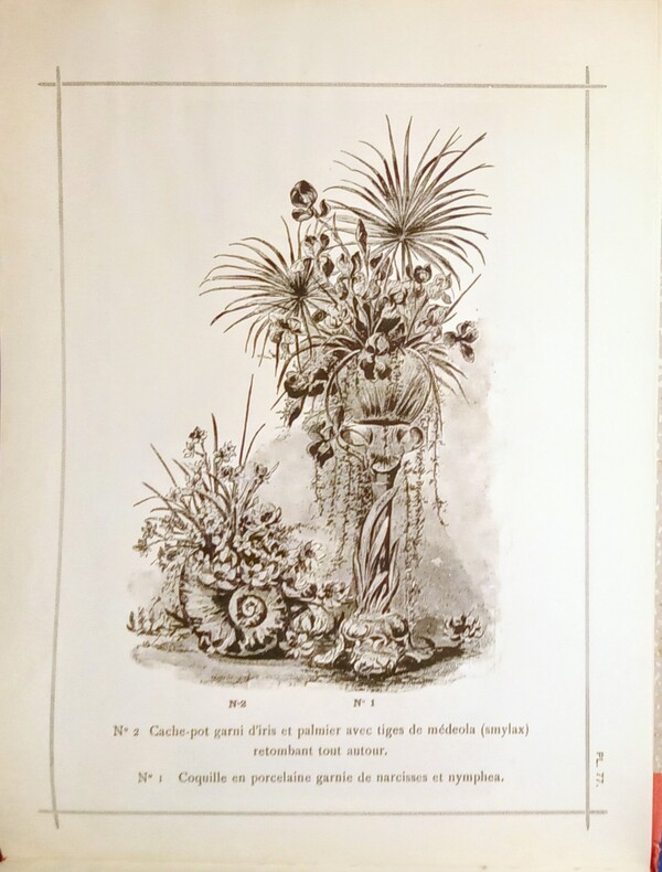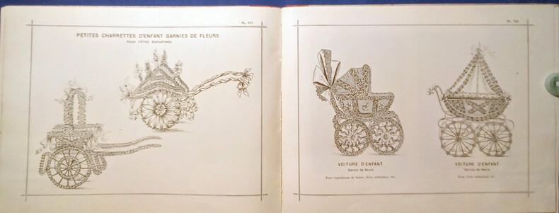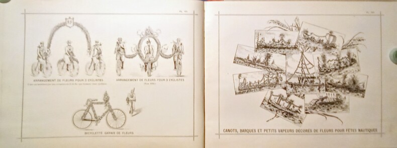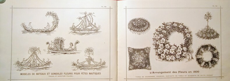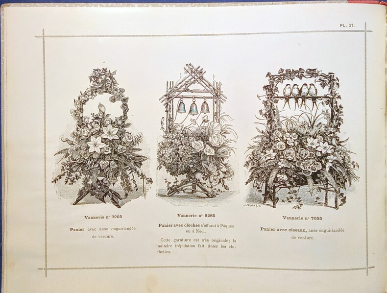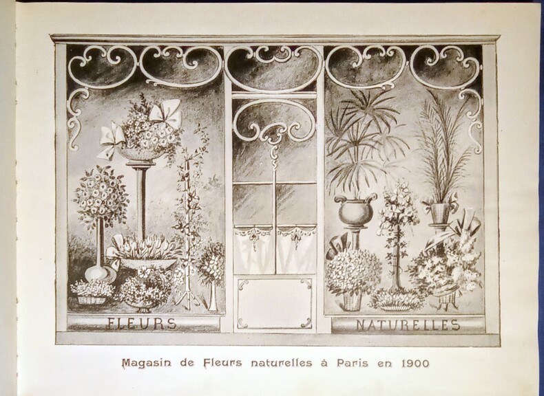 Paris. Tissot. ca 1900. In-4 à l'italienne (280 x 214 mm) cartonnage illustré en bleu de l'éditeur, dos toile rouge, plat orné d'un grand rameau de gui, 1re page illustrée de la devanture d'un magasin de fleurs naturelles à Paris en 1900, et 207 planches richement ornées de modèles pour fleuristes. Étonnante variété allant de la décoration de bicyclettes, de canots, de voitures d'enfants aux Oeufs de Pâques fleuris, en passant par d'étonnantes voitures garnies, on est surpris par l'inventivité du fleuriste. Cartonnage assez abîmé, petits défauts mais plutôt bon étét intérieur. Photos sur demande.