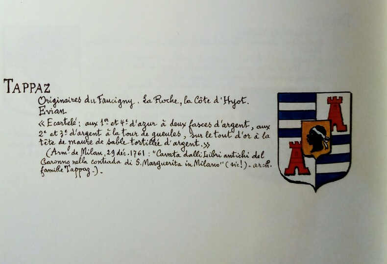 Contient: Armoiries du Royaume de Sardaigne, Chypre et de Jérusalem, Province de Chablais, Blasons des Villes (Thonon-les-Bains, Evian-les-Bains, Allinge, etc), Bureau de l'Academie Chablaisienne, les Familles des (d'Allinges aux Zonca, etc), Blasons des Etats et Fiefs de la Maison de Savoie., et Annexe (Armoiries des Villes et Familles des Autres Provinces du Duché de Savoie, spécialement du Genevois, du Faucigny qui nous sont souvent demandés. Avant-propos de Henri Baud. Genève, éditions Slatkine Reprints & Thonon-les-Bains, Archives de l'Académie Chablaisienne, 1993. Grand in-4 (31,5x20cm) allongé de reliure éditeur bleu foncé, avec le Blason de Province de Chablais en couleur sur le plat supérieur, titre et nom dorés ainsi qu'au dos. 274pp.