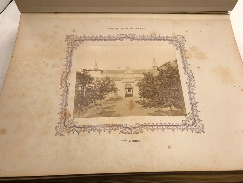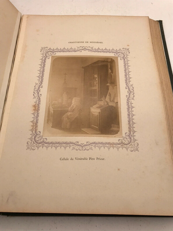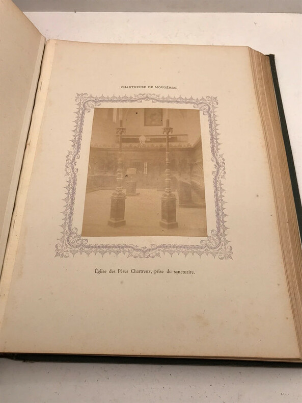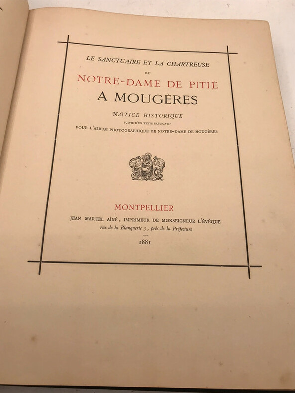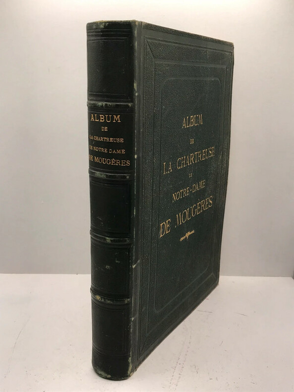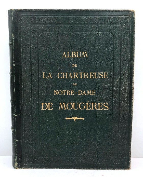 Le sanctuaire et la chartreuse de Notre-Dame de Pitié à Mougères, notice historique suivie d'un texte explicatif pour l'album photographique de Notre-Dame de Mougères. In-folio (31,5 x 24 cm), demi cuir percaline noir, titre en lettres dorées sur le premier plat, tranches dorées, Montpellier, Jean Martel aîné, imprimeur de monseigneur l'évêque, 1881, illustré de 40 photographies hors-texte, sur onglet et papier fort. Envoi autographe signé de l'auteur. Texte explicatif de 27 pages. 40 épreuves albuminées d’après négatif verre encollées sur des planches de carton fort dans des encadrements lithographiés avec légendes imprimées : 10 x 13 cm ou l’inverse. Etat : nerfs, coins, mors et coiffes émoussés par endroits, voir photos, rares rousseurs sans gravité en marge de deux des épreuves, pas de cahiers décalés : bon dans l'ensemble.