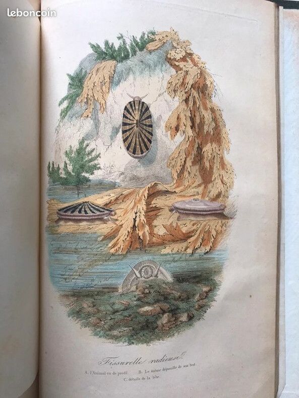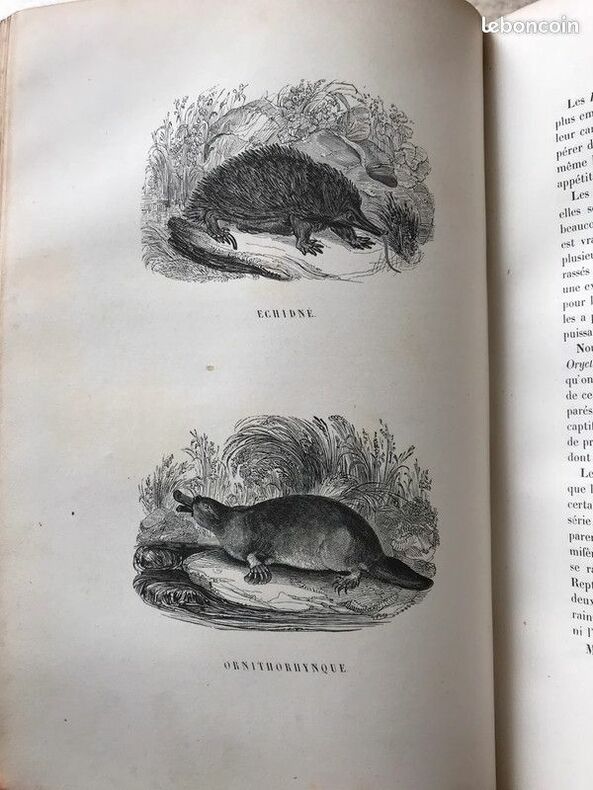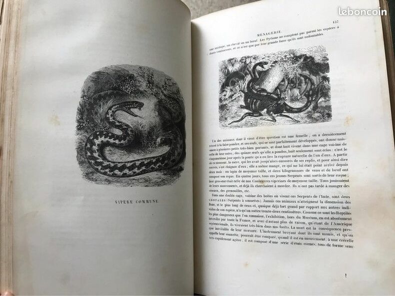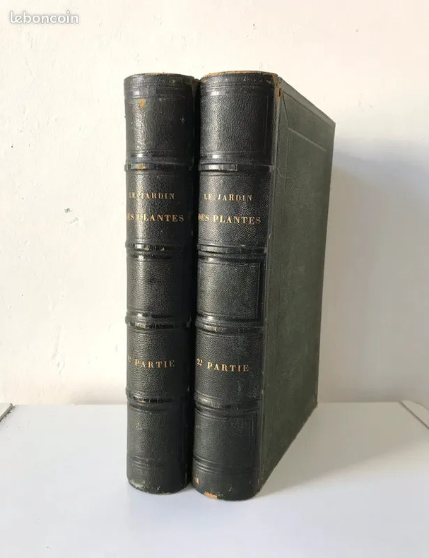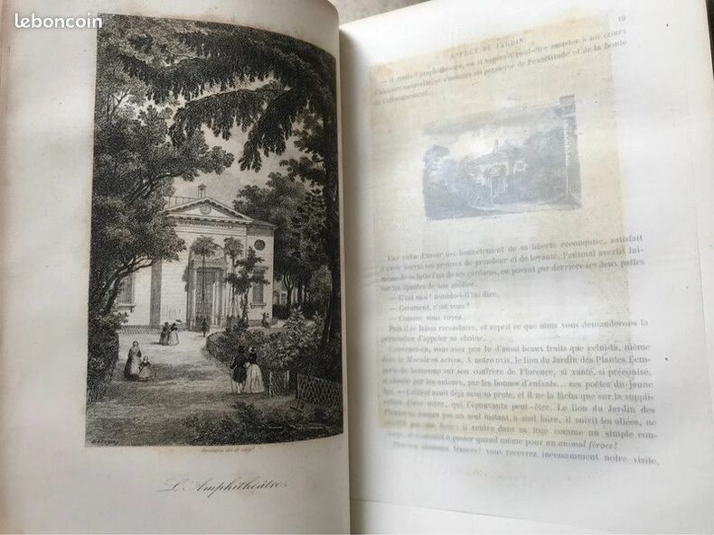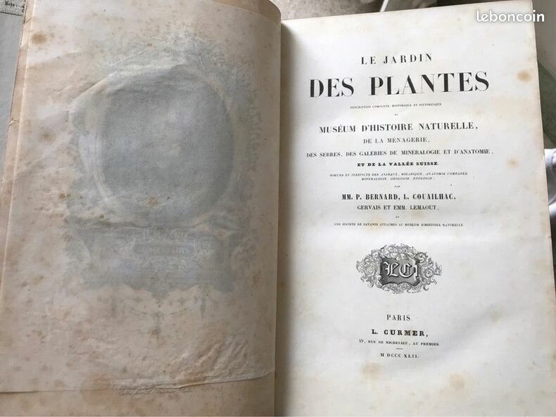 Description complète, historique et pittoresque du Muséum d’Histoire Naturelle, de la Ménagerie, des Serres, des Galeries de Minéralogie et d’Anatomie et de la Vallée Suisse. Moeurs et Instincts des Animaux, Botanique, Anatomie comparée. Minéralogie, Géologie, Zoologie. Par MM. P. Bernard, L. Couailhac, Gervais et Emm. Lemaout. Et une Société de Savants attachés au Muséum d’Histoire Naturelle. Edition originale et premier tirage des illustrations. Nombreuses illustrations dans le texte et planches en noir et blanc et couleurs. 2 volumes reliés mi-cuir noir, Curmer, Paris 1842, 18x27cm, 416+664 pages, quelques frottements sur les coins et le dos, quelques rousseurs, seulement sur certaines pages, voir les photos pour l'état.
