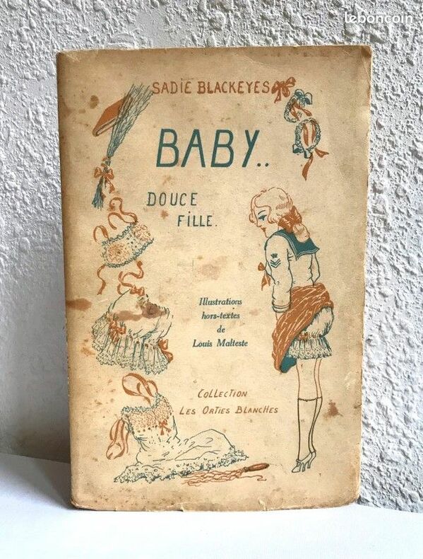 Paris, Collection des Orties Blanches sans date ( 1931 ). In-8 broché de 234 pages au format 13 x 20,5 cm à petites marges. Superbe couverture illustrée. Dos resté carré, avec bas, soigneusement recollé, et présentant de très légères plissures de lecture, ainsi que de minuscules rousseurs. Quatrième plat avec infimes brunissures. Intérieur frais, malgré que le bord extérieur des pages 11 et 12 soit un peu mal coupé, mais sans aucun impact sur le texte. Roman érotique de Pierre Mac Orlan sous le pseudonyme de Sadie Blackeyes suivi de lettres concernant la Flagellation des Femmes et des Filles. Contient de superbes illustrations en noir, hors texte, par Louis Malteste. Rare édition originale, surtout dans un tel état de fraicheur générale.