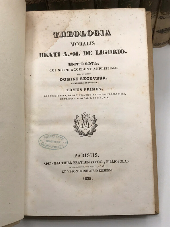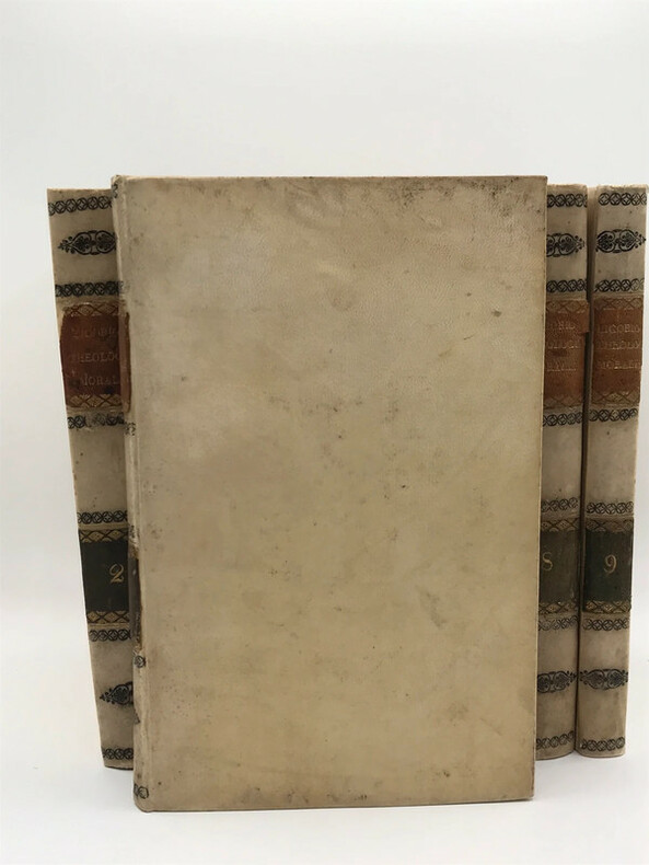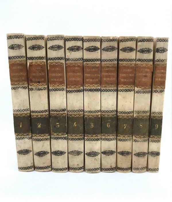 Theologia moralis beati A.-M. de Ligorio editio nova emendata, cui notae accedunt amplissimae cura et studio domini receveur. Complet de ses 9 volumes in-8° reliés plein vélin, dos lisse orné de filets noirs, pièces de titre cramel et de tomaison vert de gris. Apud Gauthier Fratrem et Soc. Bibliopolas, Parisiis, 1835, 22x15cm, entre 330 et 480 pages par volume. Quelques rousseurs claires et marginales seulement sur certaines pages, ensemble en bon état, voir photos.