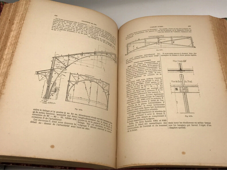 Grand in-8° relié demi-cuir rouge de 29x21cm, dos orné de motifs dorés, titre doré, 830 pages, Fanchon et Artus, éditeurs, Paris, sans date (fin XIXe). Très nombreuses figures en noir et blanc dans et hors texte. Quatrième partie du cours de construction par Gustave Oslet, ingénieur des arts et Manufactures, chef des travaux graphiques à l'école centrale. Comporte les tableaux et tous les calculs associés aux choix et montages des éléments. Bel état de la reliure, rousseurs claires en marge du texte, seulement sur quelques pages. Pas de cahiers décalés ni feuilles volantes. Sommaire : 1- Définitions et notions générales 2- Outillage du charpentier et du serrurier 3- Des assemblages 4- Différents types d’assemblages métalliques 5- Planchers en Fer 6- Stabilité des planchers de fer 7- Pans de fer 8- Des escaliers en fer et en fonte 9- Combles et fermes métalliques 10- Stabilité et résistance des fermes métalliques 11- Halles et marchés