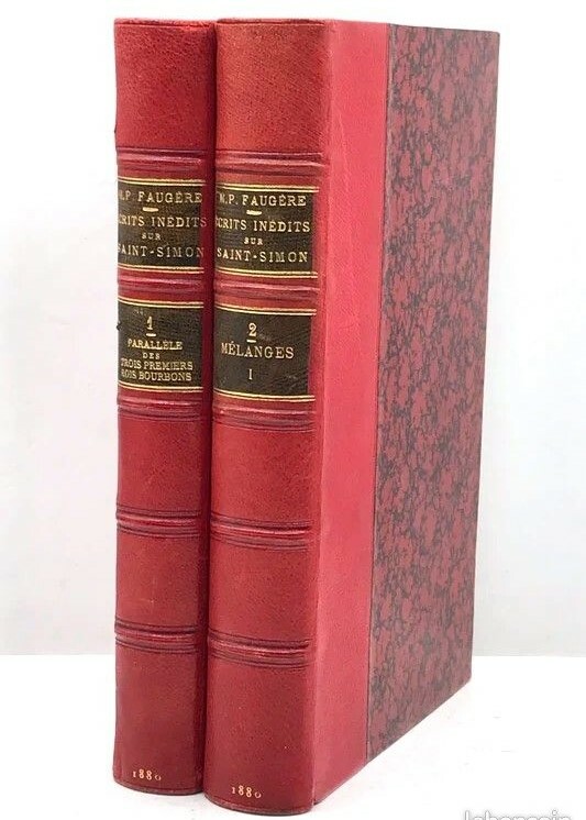 Ecrits inédits de Saint Simon publiés sur les manuscrits conservés au dépôt des affaires étrangères par M. P. Faugère. Tome premier : parallèle des trois premiers rois Bourbons. Tome deuxième : Mélanges I. Mémoire sur les légitimes. Mémoire sur la renonciation. Pièces diverses. Librairie Hachette, 1880, 2 volumes in-8 reliés demi-chagrin, dos à nerfs. Très bon état général, envoi soigné.