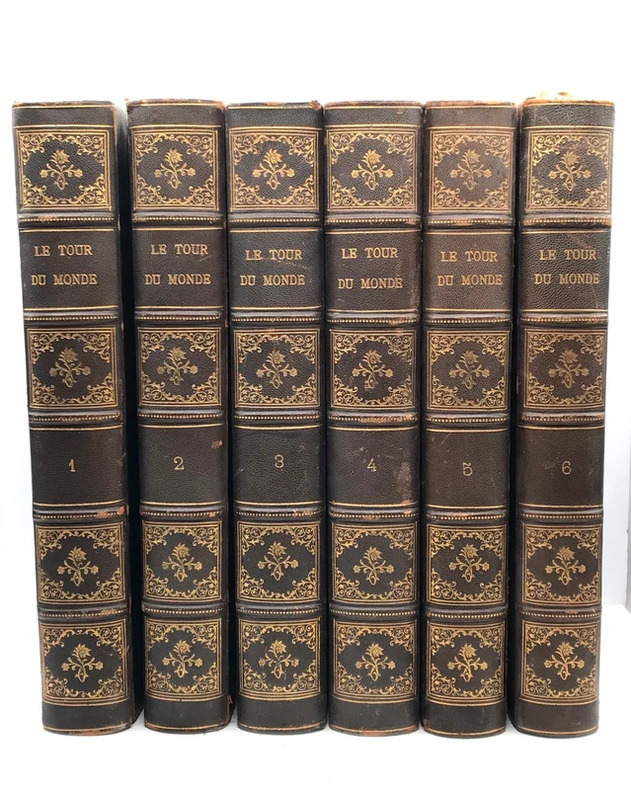 Le Tour du Monde Journal des Voyages et des Voyageurs. Fondé par Edouard Charton Nouvelle série : années 1 a 6 complètes. 6 forts volumes in-folio reliés demi-chagrin noir, dos ornés de caissons entre nerfs, plats marbrés bleu nuit. Librairie Hachette, 1895-1900, environ 7000 pages, (23,5x31,5 cm). Très richement illustré en noir et blanc in et hors texte. Quelques menus frottements sans gravité (voir la dernière photo). Intérieurs bien frais. Bel ensemble cohérent et uniforme des 6 premières années de cette nouvelle série.