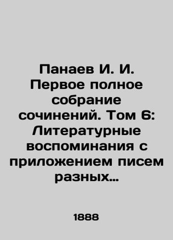 Panaev I. I. First complete collection of essays. Volume 6: Literary memoirs with attachment of letters from different persons. In Russian /Panaev I. I. Pervoe polnoe sobranie sochineniy. Tom 6: Literaturnye vospominaniya s prilozheniem pisem raznykh lits. S.-P. Publication of the bookseller N. G. Martynov, 1888, IV, 419 p.We have thousands of titles and often several copies of each title may be available. Please feel free to contact us for a detailed description of the copies available.SKUalb003474aaf9a36d9d.