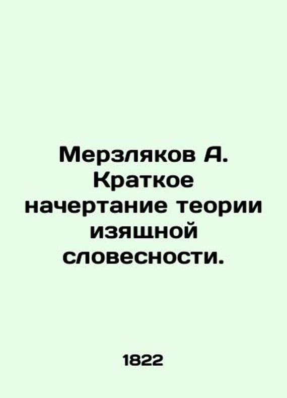 Merzlyakov A. Brief outline of the theory of fine words. In Russian (ask us if in doubt)/Merzlyakov A. Kratkoe nachertanie teorii izyashchnoy slovesnosti. Short description: In Russian (ask us if in doubt).Parts 1-2 M. University Printing House 1822. 328s. We have thousands of titles and often several copies of each title may be available. Please feel free to contact us for a detailed description of the copies available. SKUalb003926da04002909