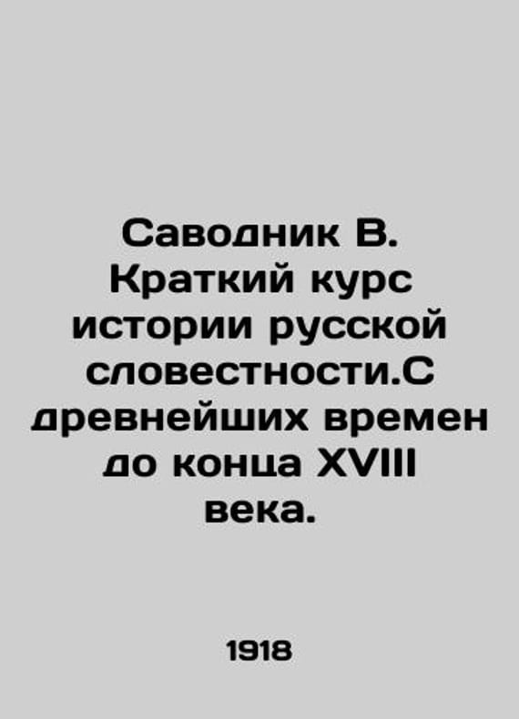 Savodnik V. A short course in the history of Russian literature. From ancient times to the end of the 18th century. In Russian /Savodnik V. Kratkiy kurs istorii russkoy slovestnosti.S drevneyshikh vremen do kontsa XVIII veka. Edition 6. Moscow. Typolithography of the T-va I. N. Kouchnerev and K. 1918. We have thousands of titles and often several copies of each title may be available. Please feel free to contact us for a detailed description of the copies available. SKUalb02330a2d0b5ef389.