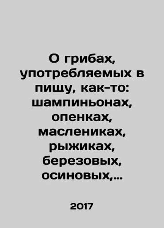 On mushrooms that are eaten, such as mushrooms, hazelnuts, shrews, redheads, birch, aspen, shrivels, truffles, etc. In Russian /O gribakh, upotreblyaemykh v pishchu, kak-to: shampinonakh, openkakh, maslenikakh, ryzhikakh, berezovykh, osinovykh, smorchkakh, trufeley i proch. Moscow Publishing House V. Sekachev 2017. We have thousands of titles and often several copies of each title may be available. Please feel free to contact us for a detailed description of the copies available. SKUalb0298c3f518d37018.