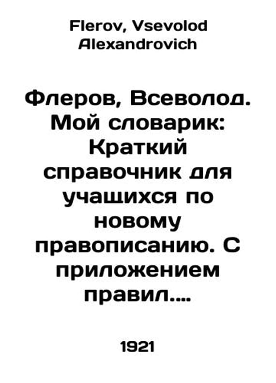 Flerov, Vsevolod. My Vocabulary: A Brief Guide for Students to the New Spelling, with Rules Appended In Russian /Flerov, Vsevolod. Moy slovarik: Kratkiy spravochnik dlya uchashchikhsya po novomu pravopisaniyu. S prilozheniem pravil. 3-e izd. M. Gosizdat 1921, 62 p., 16,5p.10,5 sm. We have thousands of titles and often several copies of each title may be available. Please feel free to contact us for a detailed description of the copies available. SKUalb065c1d8abc2cd0e8.