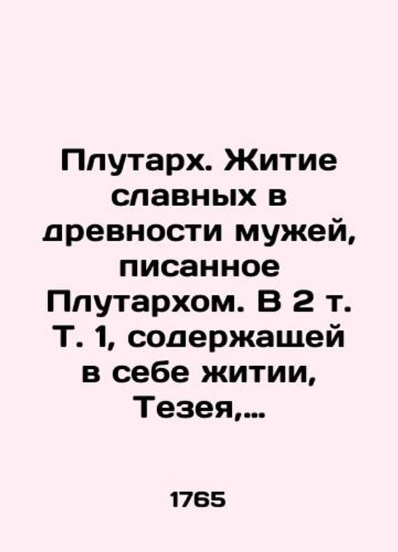 Plutarch. The Life of the Glorious Men of Antiquity, written by Plutarch. In 2 Vol. 1, which contains the Lives of Theseus, Romulus, Lycurga, and Numa Pompilius In Russian /Plutarkh. Zhitie slavnykh v drevnosti muzhey, pisannoe Plutarkhom. V 2 t. T. 1, soderzhashchey v sebe zhitii, Tezeya, Romula, Likurga i Numy Pompiliya. S ikh sravneniyami. Sergey Glebov translated from French into Russian. St. Petersburg, Type. Sukhoput. cadet corps, 1765, 6, 180 p. We have thousands of titles and often several copies of each title may be available. Please feel free to contact us for a detailed description of the copies available. SKUalb069281c09a450495.