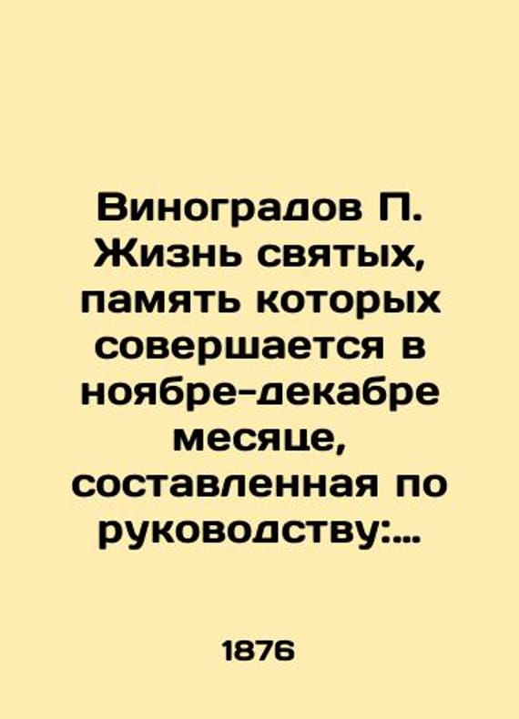 Vinogradov The life of the saints, whose memory is celebrated in November-December, is compiled according to the guide: The Four Mines, the Patristicians, the Russian saints, the Divine Liturgical Days of the Orthodox Church and other books, with a description of the Feast Days. In Russian /Vinogradov Zhizn svyatykh, pamyat kotorykh sovershaetsya v noyabre-dekabre mesyatse, sostavlennaya po rukovodstvu: Cheti-minei, Patristiki, Russkikh svyatykh, Bogosluzhebnykh dney Pravoslavnoy tserkvi i drugikh knig, s opisaniem Prazdnikov. M.: 1876. We have thousands of titles and often several copies of each title may be available. Please feel free to contact us for a detailed description of the copies available. SKUalb06fcf84991c7fcd0.