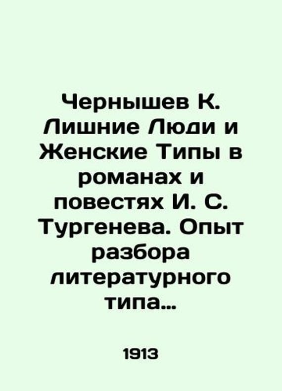 Chernyshev K. Excess People and Female Types in Novels and Novels by I. S. Turgenev. Experience in analyzing the literary type of Russian excess people as material for characterizing the development of society. In Russian /Chernyshev K. Lishnie Lyudi i Zhenskie Tipy v romanakh i povestyakh I. S. Turgeneva. Opyt razbora literaturnogo tipa russkikh lishnikh lyudey, kak material dlya kharakteristiki razvitiya obshchestva. The Experience of Discovering the Literary Type of Russian Excess People as Material for Characterizing the Development of Society. We have thousands of titles and often several copies of each title may be available. Please feel free to contact us for a detailed description of the copies available. SKUalb08128d267ca6502e.