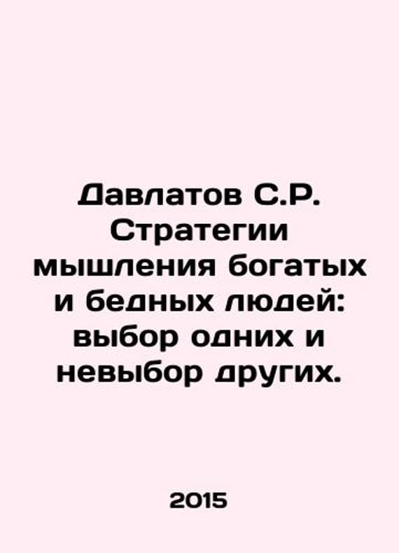 Davlatov S.R. Thinking Strategies for Rich and Poor People: Choosing Some and Not Choosing Others. In Russian /Davlatov S.R. Strategii myshleniya bogatykh i bednykh lyudey: vybor odnikh i nevybor drugikh. From the series Philosophy of the ant M. Alpina Publisher 2015.We have thousands of titles and often several copies of each title may be available. Please feel free to contact us for a detailed description of the copies available. SKUalb0848b954a03bc67d.