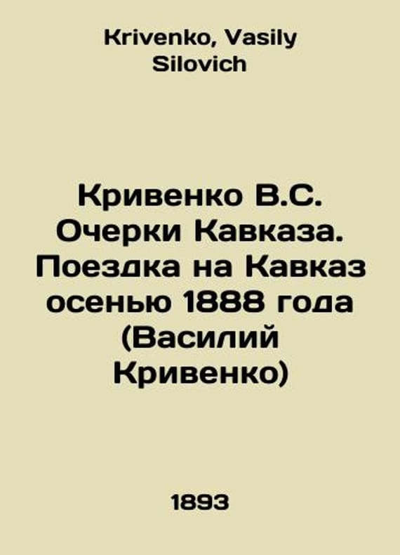 V.S. Krivenko Essays on the Caucasus. A Trip to the Caucasus in the Fall of 1888 (Vasily Krivenko) In Russian /Krivenko V.S. Ocherki Kavkaza. Poezdka na Kavkaz osenyu 1888 goda (Vasiliy Krivenko) St. Petersburg: type. A.S. Suvorina, 1893. 2, 246, II p., with illustrations. 1893. 25,6p.18,7 sm. We have thousands of titles and often several copies of each title may be available. Please feel free to contact us for a detailed description of the copies available. SKUalb09d7361bc0d416e4.