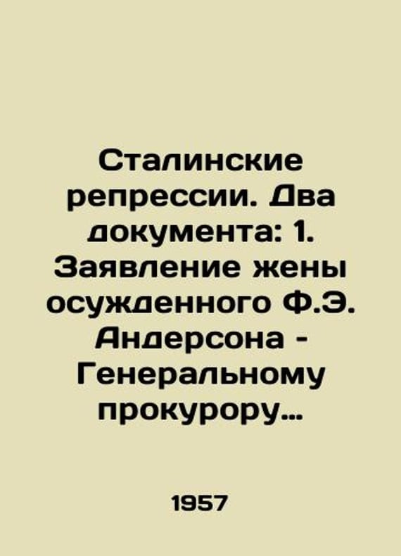 Stalins Repression. Two documents: 1. Statement by the wife of the convict F.E. Anderson to the General Prosecutor of the USSR (typewritten) 10.08.1955. 2. Certificate of Rehabilitation of the Military College of the Supreme Court of the USSR 17.08.1957. In Russian (ask us if in doubt)/Stalinskie repressii. Dva dokumenta: 1. Zayavlenie zheny osuzhdennogo F.E. Andersona - Generalnomu prokuroru SSSR (mashinopis) 10.08.1955. 2. Spravka o reabilitatsii Voennoy kollegii Verkhovnogo suda SSSR 17.08.1957.M. 1955 1957 3 p. We have thousands of titles and often several copies of each title may be available. Please feel free to contact us for a detailed description of the copies available. SKUalb09ecad8f401208d0