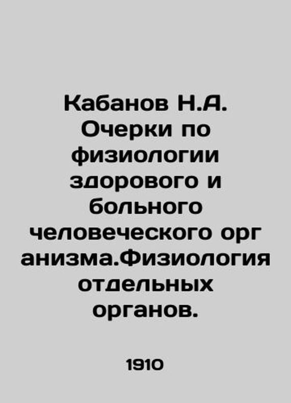 Boar N.A. Essays on the Physiology of the Healthy and Diseased Human Body. Physiology of Individual Organs. In Russian /Kabanov N.A. Ocherki po fiziologii zdorovogo i bolnogo chelovecheskogo organizma.Fiziologiya otdelnykh organov. N. Kabanov, victor.-doc.doc. Moscow University.: M. and S. Sabashnikov, 1910. XVI, 489 p.We have thousands of titles and often several copies of each title may be available. Please feel free to contact us for a detailed description of the copies available.SKUalb0a9b6043c021c211.