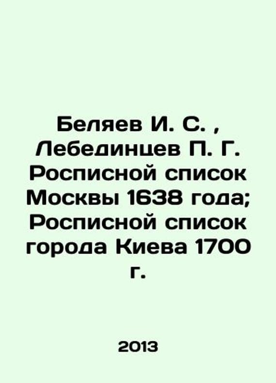 "I. S. Belyaev, P. G. Lebedintsev Painting List of Moscow 1638; Painting List of Kyiv 1700 In Russian /Belyaev I. S., Lebedintsev P. G. Rospisnoy spisok Moskvy 1638 goda; Rospisnoy spisok goroda Kieva 1700 g. Model 5 Moscow Publishing House, V. Sekachev, 2013, 416 p. We have thousands of titles and often several copies of each title may be available. Please feel free to contact us for a detailed description of the copies available. SKUalb0b74258c7360d775."