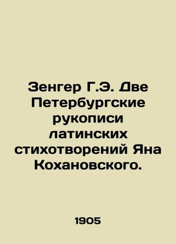 Zenger G.E. Two St. Petersburg manuscripts of Latin poems by Jan Kokhanovsky. In Russian /Zenger G.E. Dve Peterburgskie rukopisi latinskikh stikhotvoreniy Yana Kokhanovskogo. Notes of the Imperial Academy of Sciences on the Historical and Philological Department. Volume 7. # 1. St. Petersburg: 1905. We have thousands of titles and often several copies of each title may be available. Please feel free to contact us for a detailed description of the copies available. SKUalb0fcb2e00874519e5.