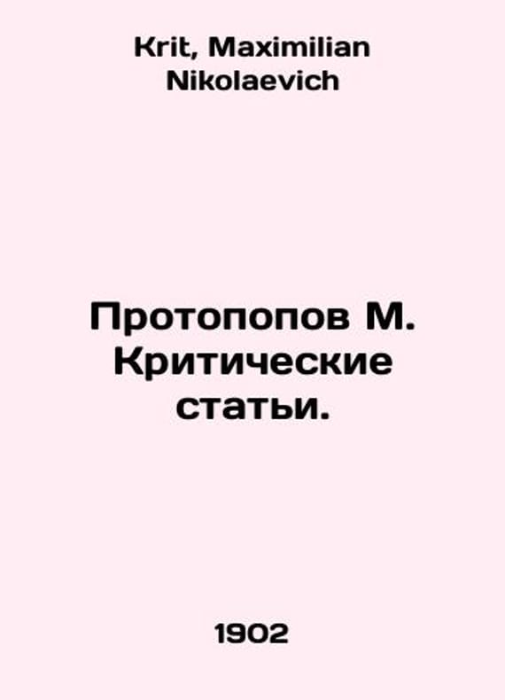 Protopov M. Critical Articles. In Russian /Protopopov M. Kriticheskie stati. The Third Thousand Moscow, S. Skirmunt Edition, 1902. 500 p. We have thousands of titles and often several copies of each title may be available. Please feel free to contact us for a detailed description of the copies available. SKUalb12004a7ef70e8131.