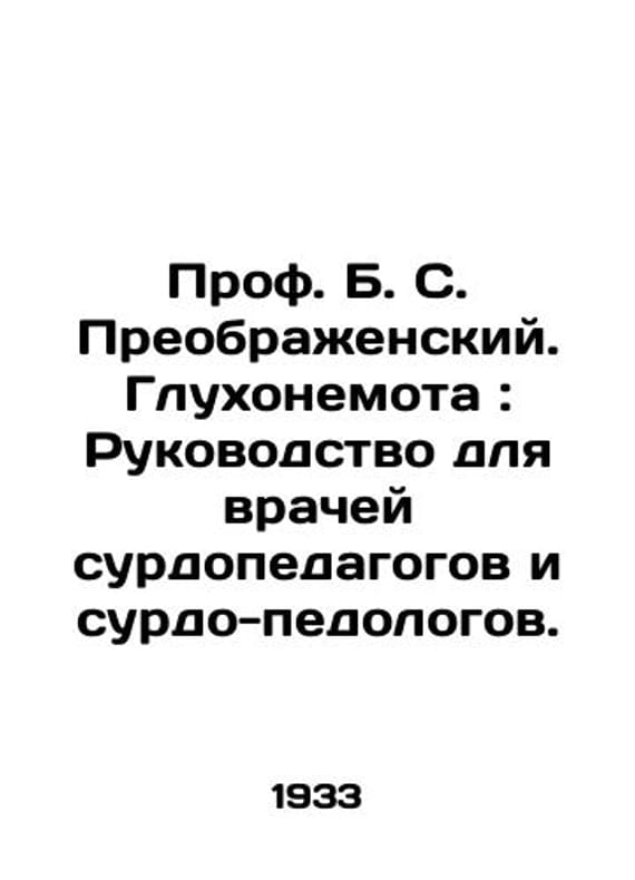 Prof. B. S. Preobrazhensky. Deafness: A Guide for Physicians of Surveyors and Surveyors-pedologists. In Russian (ask us if in doubt)/Prof. B. S. Preobrazhenskiy. Glukhonemota: Rukovodstvo dlya vrachey surdopedagogov i surdo-pedologov.. Short description: In Russian (ask us if in doubt).Moscow: State Medical Publishing House. 1933. 248 p. We have thousands of titles and often several copies of each title may be available. Please feel free to contact us for a detailed description of the copies available. SKUalb135d9d08c7e11d21