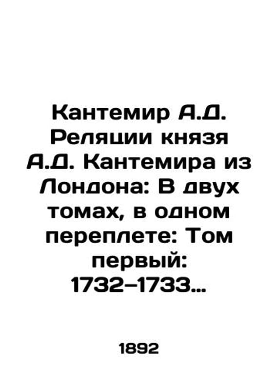 """Cantemir A.D. Relationships of Prince A.D. Cantemir of London: In two volumes one cover: Volume One: 1732-1733; Volume Two: 1734-1735. In Russian (ask us if in doubt)/Kantemir A.D. Relyatsii knyazya A.D. Kantemira iz Londona: V dvukh tomakh v odnom pereplete: Tom pervyy: 1732 1733 gg. Tom vtoroy: 1734 1735 gg. Short description: In Russian (ask us if in doubt).With an introduction and notes by V.N. Aleksandrenko professor at Warsaw University. Edition of the Imperial Society of History and Antiquities of Russia at Moscow University We have thousands of titles and often several copies of each title may be available. Please feel free to contact us for a detailed description of the copies available. SKUalb139e4649ac37d3dc"""