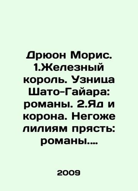 Druon Maurice. 1. Iron King. Prisoner of Chateau-Gaillard: novels. 2. Poison and crown. No lily yarn: novels. 3. French wolf. Lily and lion: novels. 4. When the king destroys France: novel. In Russian /Dryuon Moris. 1.Zheleznyy korol. Uznitsa Shato-Gayara: romany. 2.Yad i korona. Negozhe liliyam pryast: romany. 3.Frantsuzskaya volchitsa. Liliya i lev: romany. 4.Kogda korol gubit Frantsiyu: roman. The Cursed Kings of M. Eksmo series. 2009. 624s.We have thousands of titles and often several copies of each title may be available. Please feel free to contact us for a detailed description of the copies available.SKUalb14fbdf69ebc1272b.