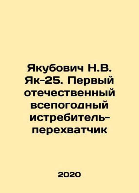 Yakubovich N.V. Yak-25. The first domestic all-weather fighter-interceptor In Russian /Yakubovich N.V. Yak-25. Pervyy otechestvennyy vsepogodnyy istrebitel-perekhvatchik M . 2020 160p..We have thousands of titles and often several copies of each title may be available. Please feel free to contact us for a detailed description of the copies available.SKUalb1514039f9f67e13a.
