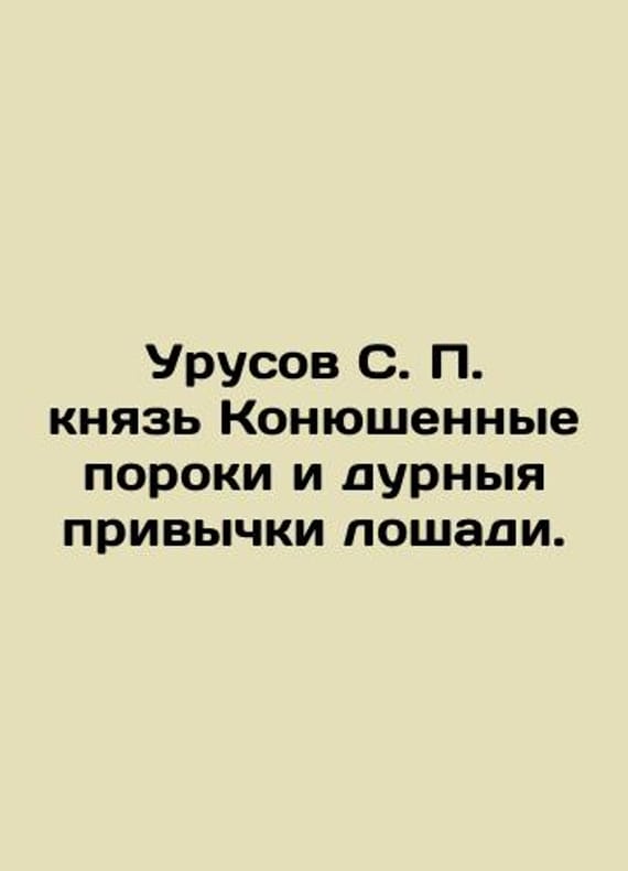 Urusov S. Prince Stable vices and bad habits of the horse. In Russian /Urusov S. knyaz Konyushennye poroki i durnyya privychki loshadi. Moscow Publishing House V. Sekachev 2021. 76s. We have thousands of titles and often several copies of each title may be available. Please feel free to contact us for a detailed description of the copies available. SKUalb151a67d8a51584fe.