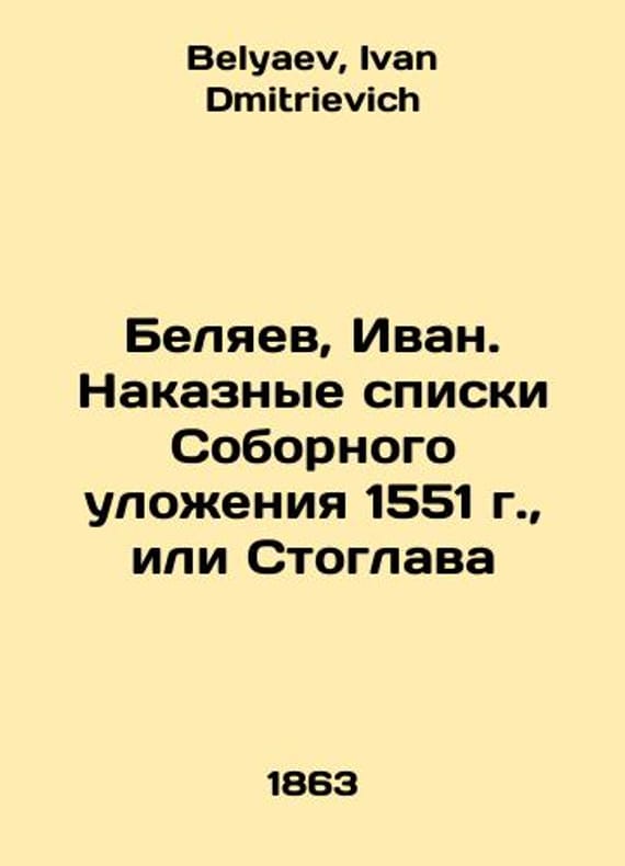 Belyaev, Ivan. Punishment lists of the Council Statute of 1551, or Stoklav In Russian /Belyaev, Ivan. Nakaznye spiski Sobornogo ulozheniya 1551 g., ili Stoglava Moscow type. Bakhmetev 1863. 57s. We have thousands of titles and often several copies of each title may be available. Please feel free to contact us for a detailed description of the copies available. SKUalb15319751da8ccf2a.