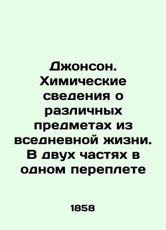 Johnson. Chemical information about various objects from everyday life. In two parts in one cover In Russian (ask us if in doubt)/Dzhonson. Khimicheskie svedeniya o razlichnykh predmetakh iz vsednevnoy zhizni. V dvukh chastyakh v odnom pereplete Short description: In Russian (ask us if in doubt).Translated and edited by A.N. Khodnev in St. Petersburg: Edition of the Trade House of S. Strugovshchikov G. Pokhitonov N. Vodova and Co. 1858. 4 331 XI + 2 299 XIIIIc. With engraved black and white illustrations in the text.